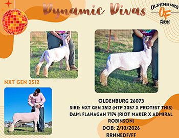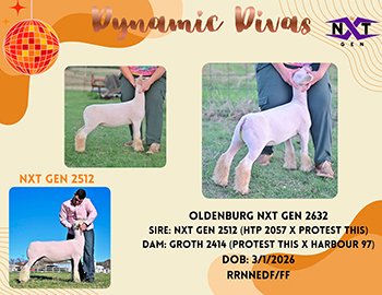 2 years ago we brought home “QUEEN” from the Divas, $22k high seller from Amstutz. In her short career she has already made her mark - she flushes huge numbers and the sheep have performed. Her leading wether in 2025 was successfully shown by Zerbach’s hammering at the top at many of the biggest shows across the country, recently was selected as sale qualifier at OYE. Fast forward to 2026 and this is the first public offering of a direct daughter of Queen. She looks just like her mom - ultra complete, ultra stout, ultra wide. She is sired by The DiFFerence, a son of The Wizard out of the stoutest Big Chill female on our farm, Wheaton 20-161. |